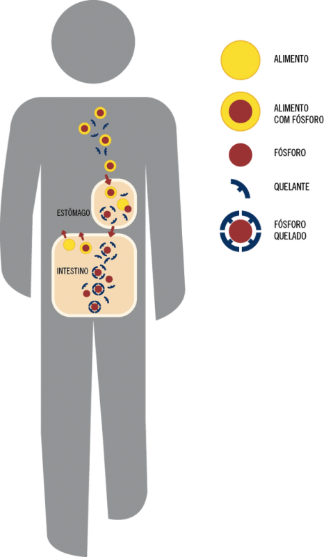 Na natureza, o fósforo está presente em muitos alimentos, principalmente nos proteicos (construtores). Por isso, fica impossível eliminar todo o fósforo da dieta. Para ajudar na diminuição do excesso de fósforo, os médicos prescrevem remédios chamados quelantes de fósforo. No estômago e no intestino, esses quelantes grudam-se no fósforo dos alimentos. Assim, o fósforo é eliminado nas fezes, junto com o quelante, sem ir para o sangue.Os quelantes de fósforo devem ser tomados nas refeições e nos lanches ou, no máximo, até trinta minutos depois. Se ingeridos com o estômago vazio, não vão ter muito efeito.